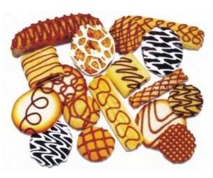 該機(jī)專門用于餅干殛巧克力表面飾巧克力花紋,且由多種花紋可供選擇(圖示花紋僅供參考)。 該機(jī)通過電機(jī)產(chǎn)生縱向、橫向兩個動作使?jié){管運(yùn)動,而運(yùn)動的漿管內(nèi)的巧克力由漿泵壓出,在鋼絲網(wǎng)上運(yùn)動的巧克力或餅干表面飾上花紋。經(jīng)簡單調(diào)整就能產(chǎn)生多種花紋圖案 | |